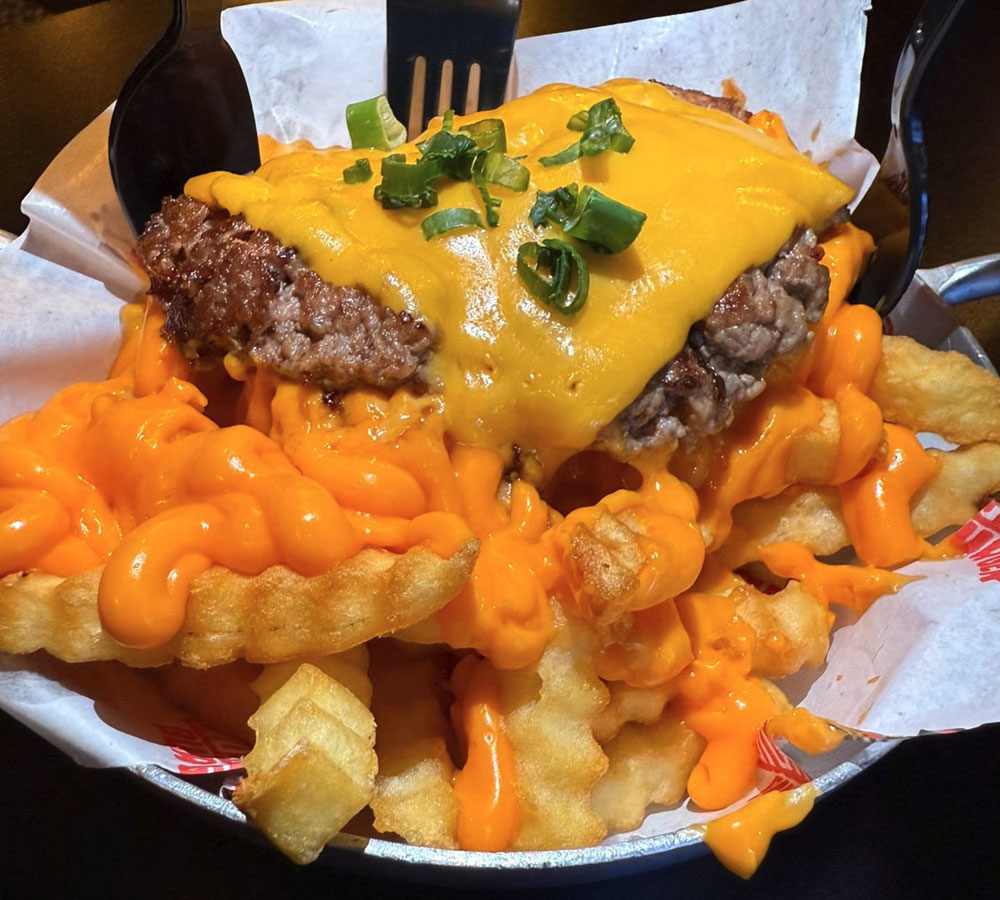 Deliciosa porção de batata Crinkle coberta com Catupiry Original e 1 suculento smash de 110g com queijo mussarela derretido.