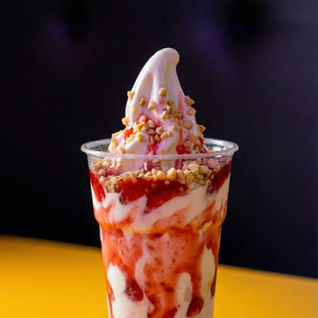Delicioso sorvete com calda de Morango e Amendoim.